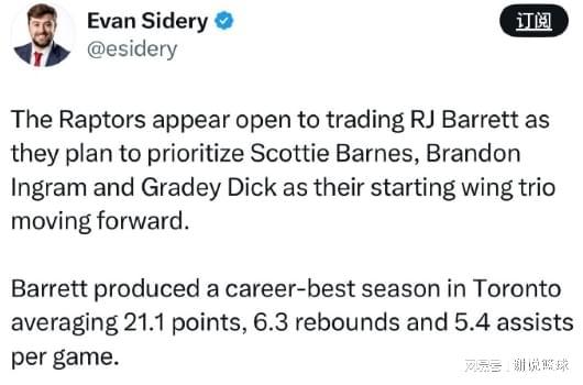 过去的24-25赛季,猛龙又是只拿到30场胜利,哪怕在孱弱的东部,也只排名第11位,又一次无缘季后赛。而根据记者埃文-西德里报道,这支东部重建队,有可能在今年夏天,对阵容进行重新洗牌。其中昔日探花RJ-巴雷特或许会被卖掉,前湖人新星布兰登-英格拉姆将受到重用,他预计跟斯科特-巴恩斯以及格雷迪-迪克,成为猛龙先发侧翼。