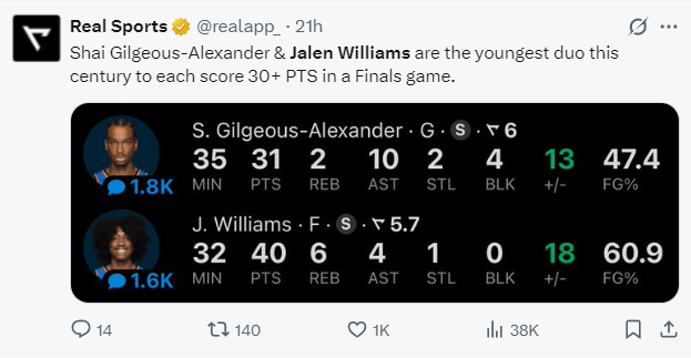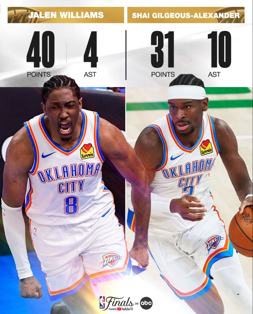6.杰威与SGA也是雷霆队史首对总决赛30+组合;