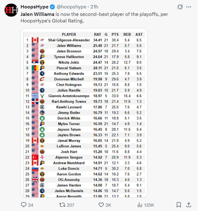 经过最近三场比赛杰威场均31分的表现,他的RAT值25.40冲到了联盟第二,联盟第一的就是SGA,看起来这两人得争夺FMVP了。