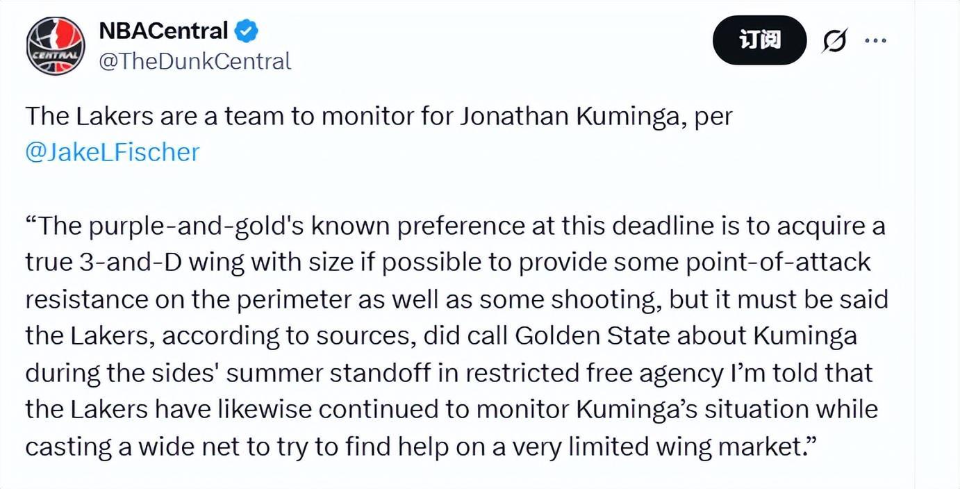 Fischer写道:“紫金军团在本次交易截止日前的明确诉求是,若条件允许,引进一位身材出众的纯正3D侧翼球员——既能在外线对持球进攻球员形成有效防守对抗,又能贡献稳定的外线投射。不过据消息源透露,有一点必须说明,早在今年夏天库明加成为受限制自由球员、湖勇双方就此陷入谈判僵局期间,湖人就曾就库明加的交易事宜联系过金州勇士。据悉,湖人此后也始终在持续关注库明加的情况,同时在球员可选范围极小的侧翼市场上广撒网,力求找到合适的补强人选。”
